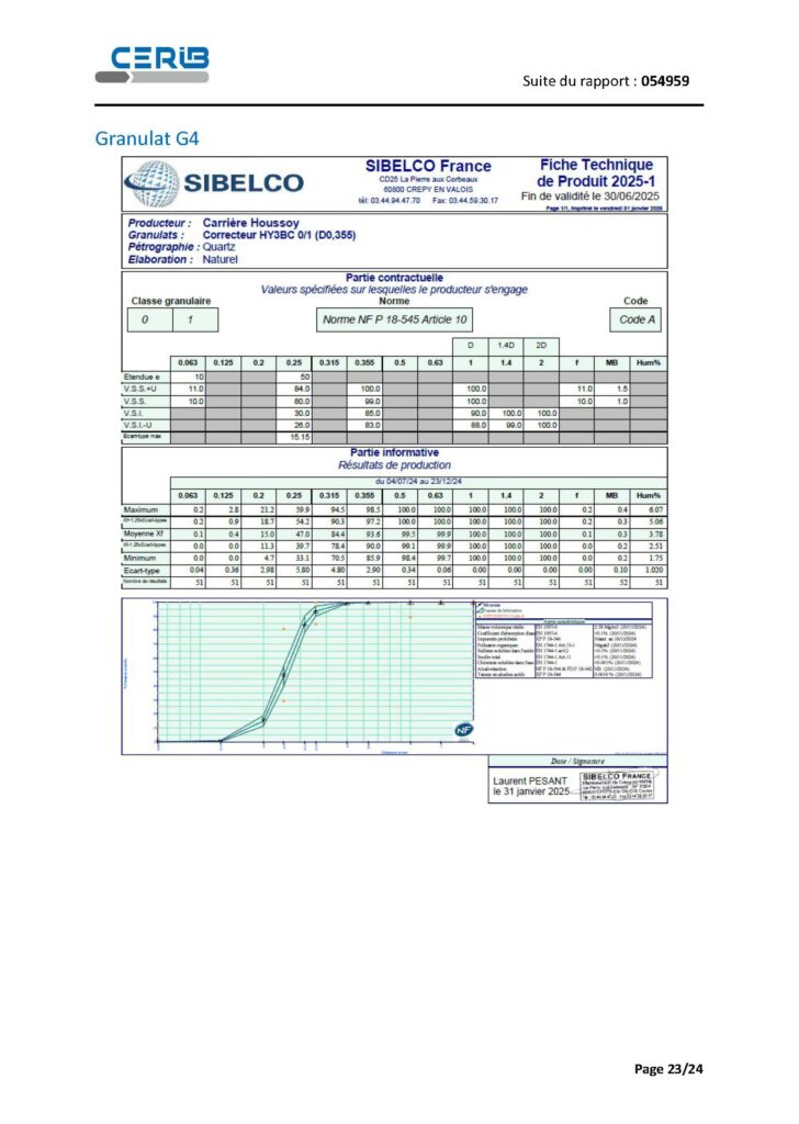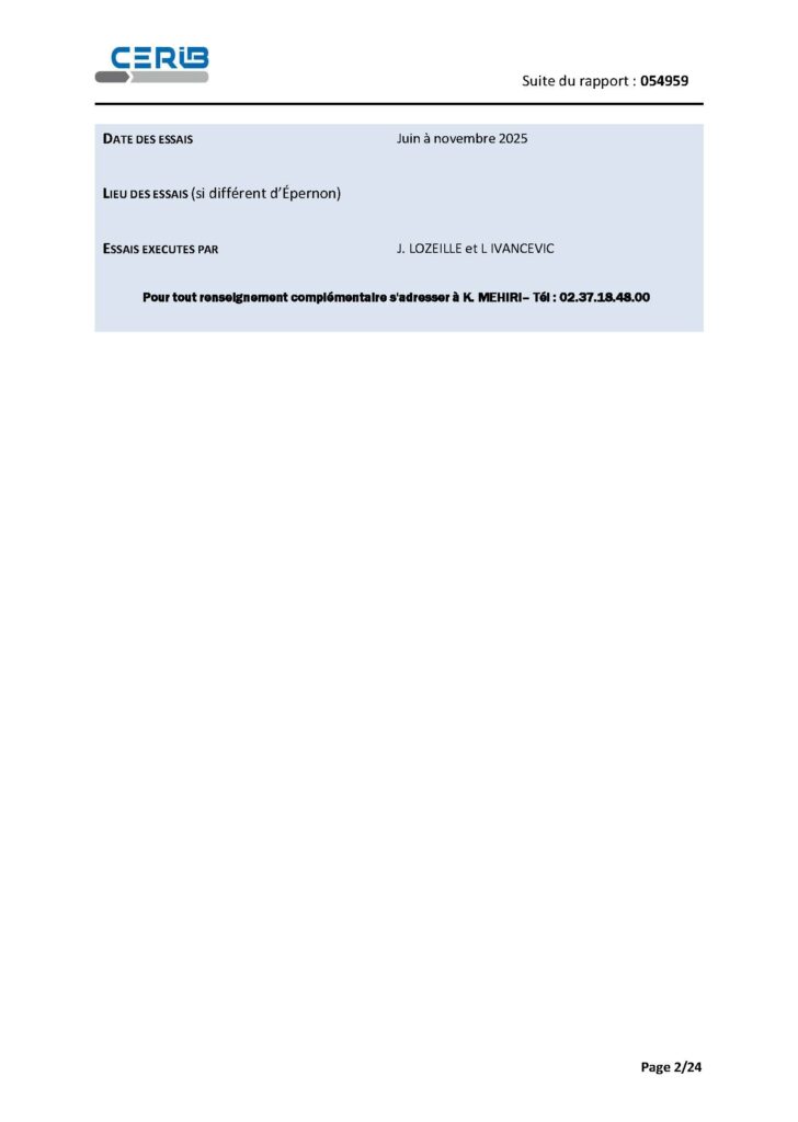 Cette synthèse s’appuie sur le rapport d’essai CERIB n°054959, édité le 22/12/2025. Le rapport rappelle que ses résultats portent sur l’échantillon reçu et testé.