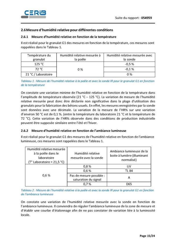 Dans la plage observée (21 °C à 125 °C), le rapport constate une variation minime : une variation de l’ordre de 0,1 % d’humidité relative pour ~50 °C, et qualifie cette variation de non significative pour l’usage visé sur granulats en bétons usuels.
