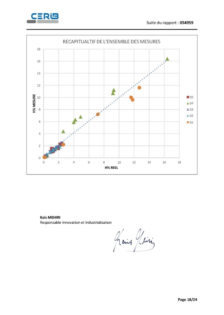 À l’échelle de l’ensemble des points, le rapport propose un récapitulatif graphique reliant humidité « réelle » et humidité mesurée, utile pour visualiser la dispersion par granulat.