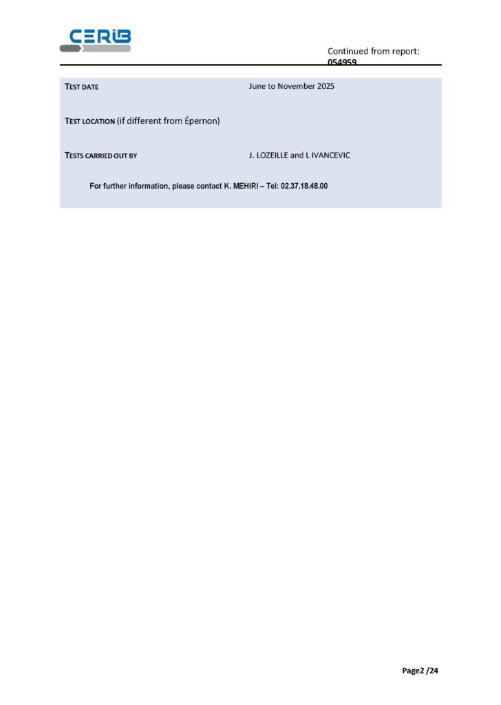 Summary is based on CERIB test report no. 054959, published on 22/12/2025. The report states that its results relate to the sample received and tested, and that the document does not constitute product certification; reproduction of the report is authorised only in its entirety.