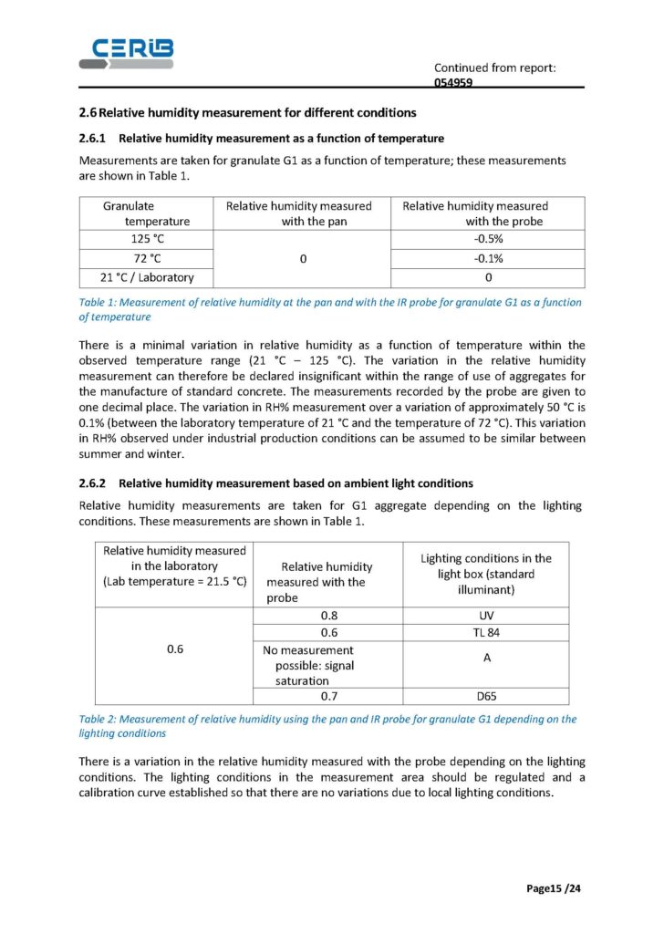 In the range observed (21°C to 125°C), the report notes a minimal variation: a variation of around 0.1% relative humidity for ~50°C, and qualifies this variation as insignificant for the intended use on aggregates in standard concrete.